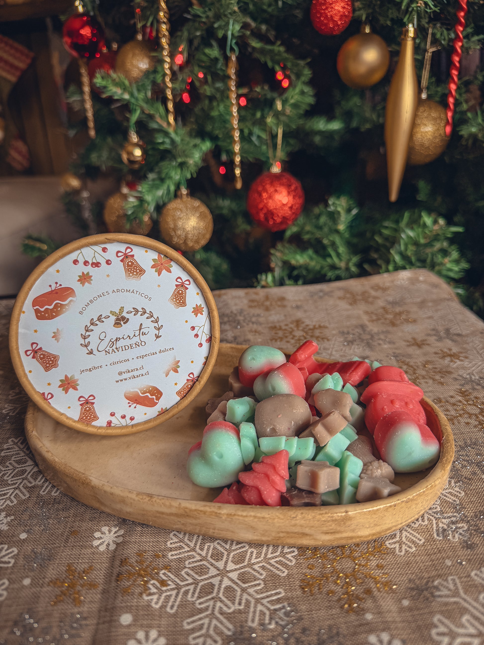 Nuestros bombones aromáticos navideños están hechos a mano con cera de soya natural y esencias premium que transforman cualquier espacio en un rincón cálido y festivo.