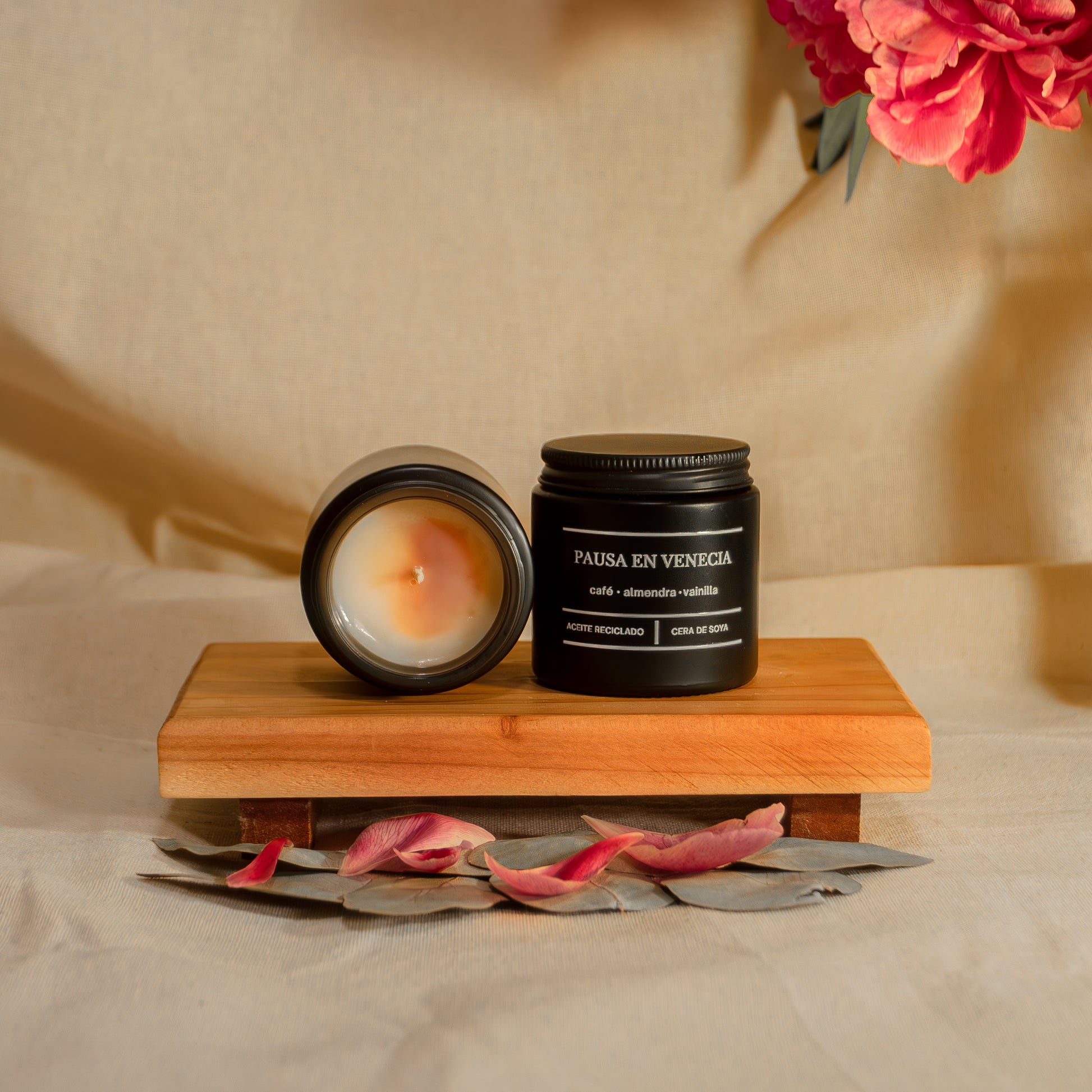 Vela hecha a mano en base a soya y aceite reciclado. Una mezcla perfecta entre la textura suave, cremosa y moldeable de la soya, que permite diseños únicos y creativos, y la reutilización del aceite reciclado, una segunda vida a un elemento que habitualmente se desecha y daña el medio ambiente.