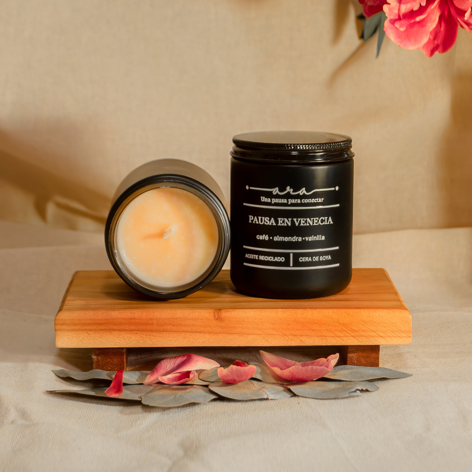 Vela hecha a mano en base a soya y aceite reciclado. Una mezcla perfecta entre la textura suave, cremosa y moldeable de la soya, que permite diseños únicos y creativos, y la reutilización del aceite reciclado, una segunda vida a un elemento que habitualmente se desecha y daña el medio ambiente.
