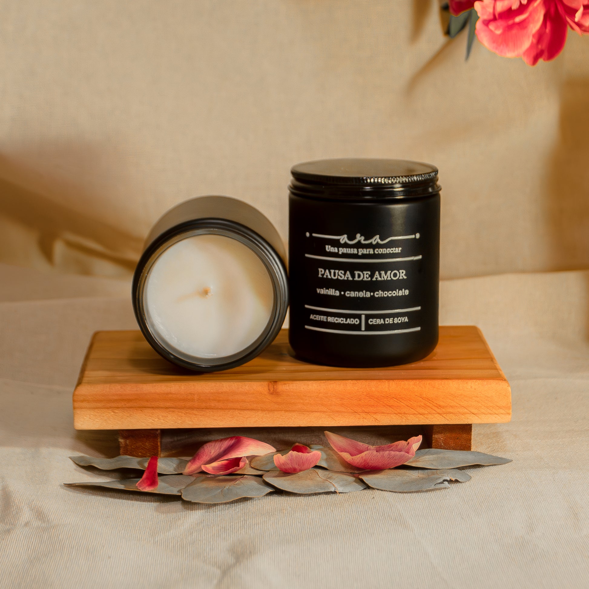 Vela hecha a mano en base a soya y aceite reciclado. Una mezcla perfecta entre la textura suave, cremosa y moldeable de la soya, que permite diseños únicos y creativos, y la reutilización del aceite reciclado, una segunda vida a un elemento que habitualmente se desecha y daña el medio ambiente.