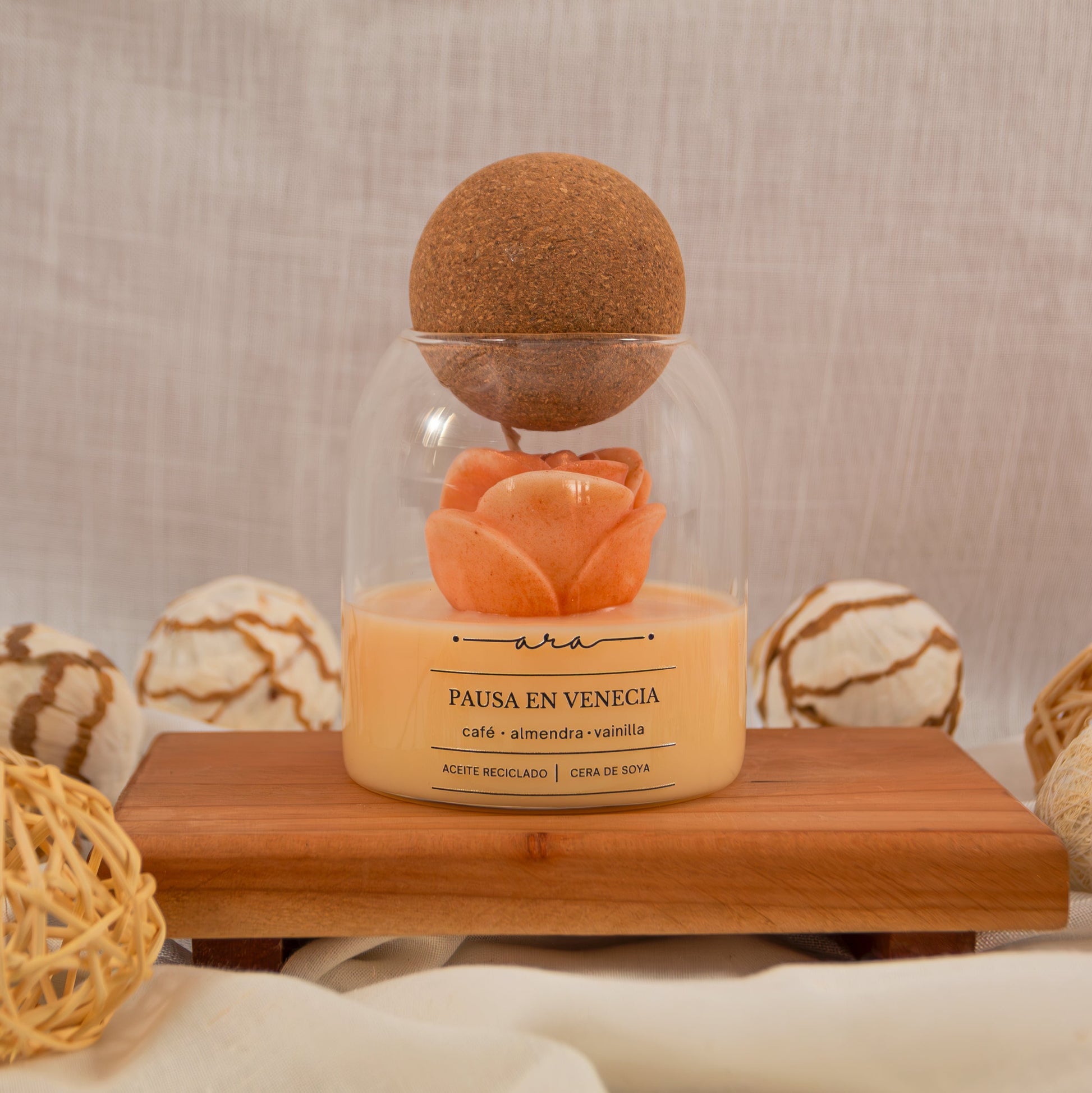 Elegante diseño de flor, ideal para decorar y dar vida a tus espacios. Envase de vidrio y tapa redonda de corcho. Ideal como regalo. Duración 45 hrs. aprox.