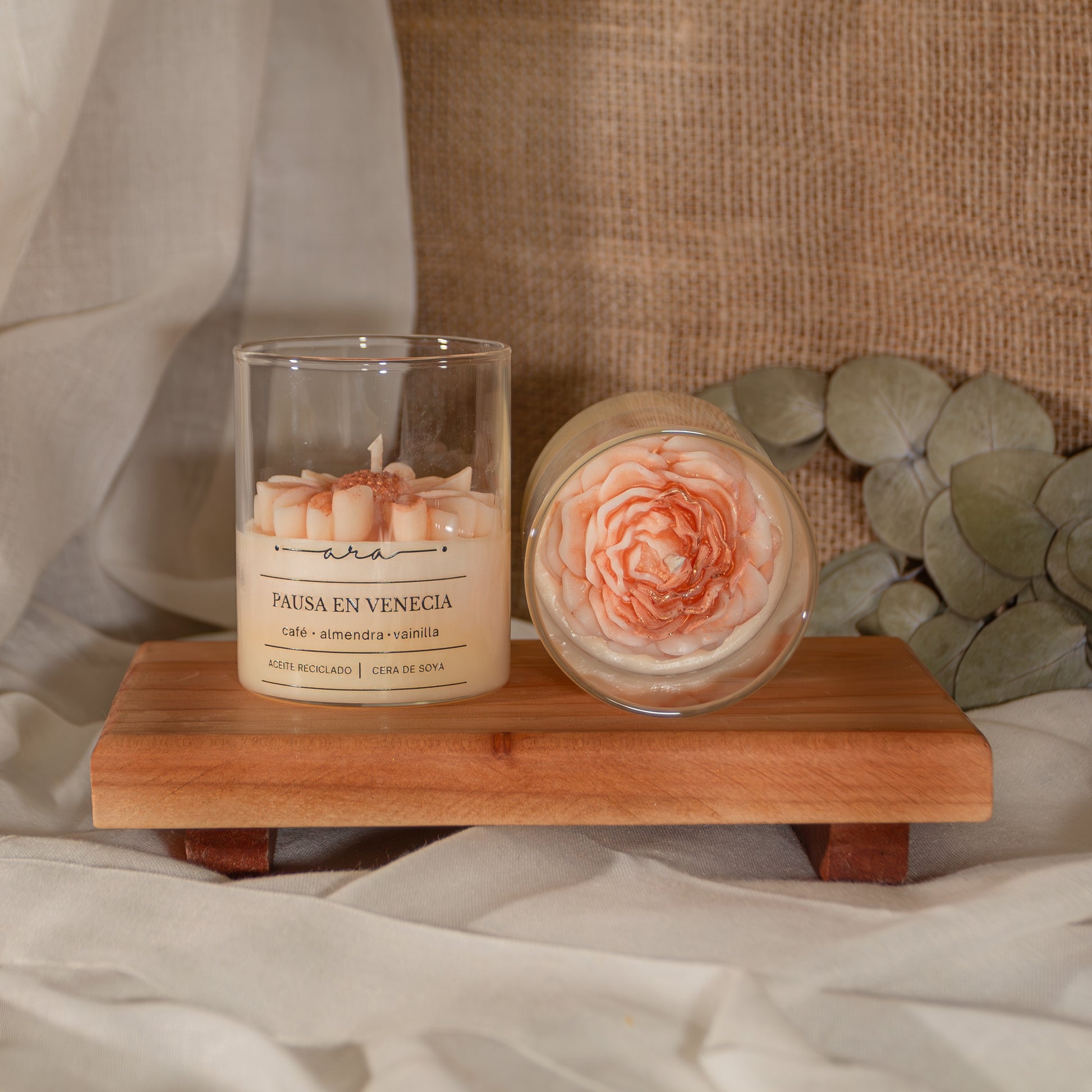Vela hecha a mano en base a soya y aceite reciclado. Una mezcla perfecta entre la textura suave, cremosa y moldeable de la soya, que permite diseños únicos y creativos; y la reutilización del aceite reciclado. Una segunda vida a un elemento que habitualmente se desecha y daña el medio ambiente.