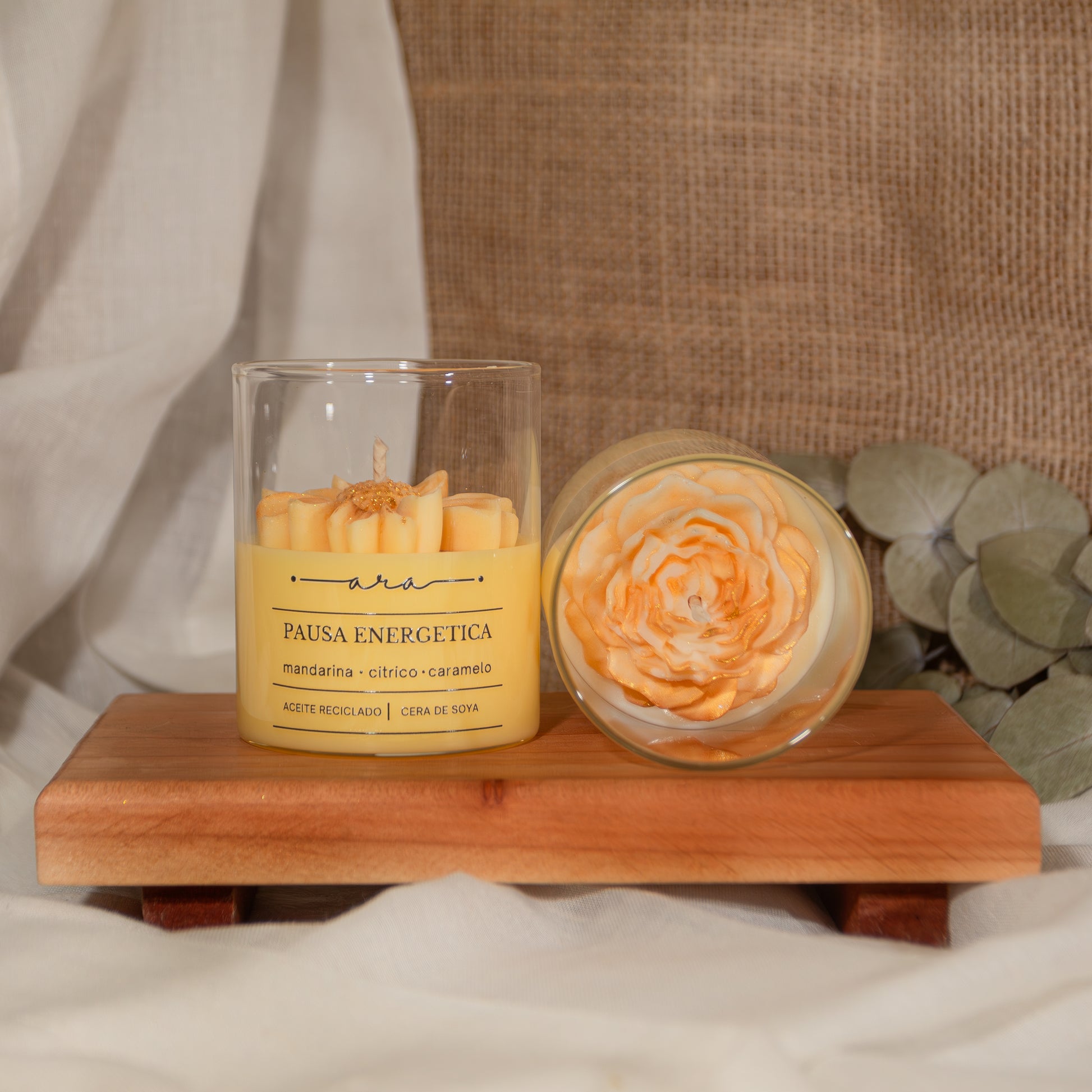 Vela hecha a mano en base a soya y aceite reciclado. Una mezcla perfecta entre la textura suave, cremosa y moldeable de la soya, que permite diseños únicos y creativos; y la reutilización del aceite reciclado. Una segunda vida a un elemento que habitualmente se desecha y daña el medio ambiente.
